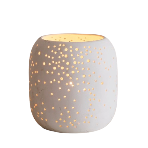 Crafted of porcelain, the perforated design of our Pierced Hurricanes & Vases cast a soft glow that's reminiscent of the night sky when lit from within!